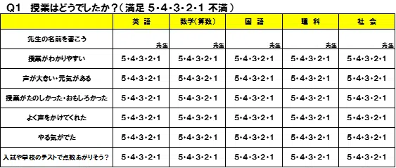 臨海セレクトは月に一度、生徒による「講師評価アンケート」を実施しています。「授業がわかりやすい」「授業が楽しかった」など、講師ごとに「5段階評価」を書いてもらいます。「悩み事はありませんか?」など、子どもたちの「総合的なサポート」のためのアンケート項目もあります!