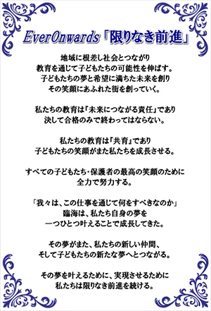 私たちは、授業料・実績・面倒見で、全国No.1の地域貢献を目指す学習塾です。地域の皆様に支えられながら、子どもたちとともに成長して参りました。得点、成績、内申、偏差値UP、合格のために、より良い授業の他に何をしなければならないかを考えています。徹底した補習、課題管理、テスト対策、やる気向上のための説得、コミュニケーションといった「付加価値」が面倒見となります。その面倒見の良さと、しつけ・けじめ・感謝・礼節指導がなければ、学力向上、成績UPはできません。臨海講師陣は、日夜これを研鑽しています。