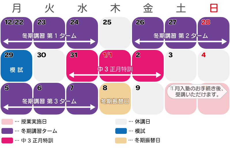 ターム制となっており、3日間連続で同じ時間帯にご通塾いただきます。季節講習はこの1枠(3日間)を『1講座』と数えます。