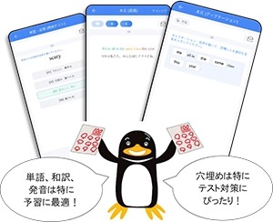 発音、意味を暗記し、選択問題や穴埋め問題に答えて演習していきます。学校の授業の予習にも便利ですし、テスト対策にも有効です。