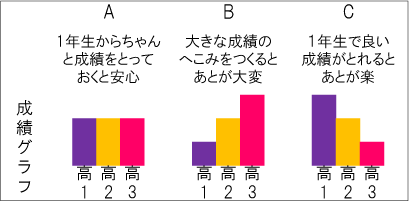 評定平均は高1から高3までの成績の平均なので、高1のはじめに油断して、大きな成績のへこみをつくってしまうと、後から取り返すことが難しくなります。逆に、1年生はまだまだ油断している生徒が多いので、大きなチャンスです。