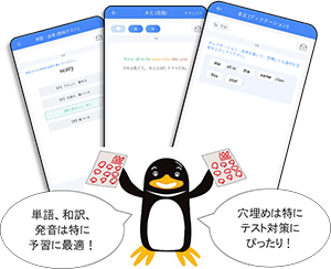 発音、意味を暗記し、選択問題や穴埋め問題に答えて演習していきます。学校の授業の予習にも便利ですし、テスト対策にも有効です。