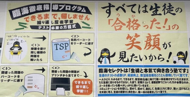 臨海セレクトの指導方針!臨海徹底指導プログラム!(TSP) 四コマの絵。確認してみてください。